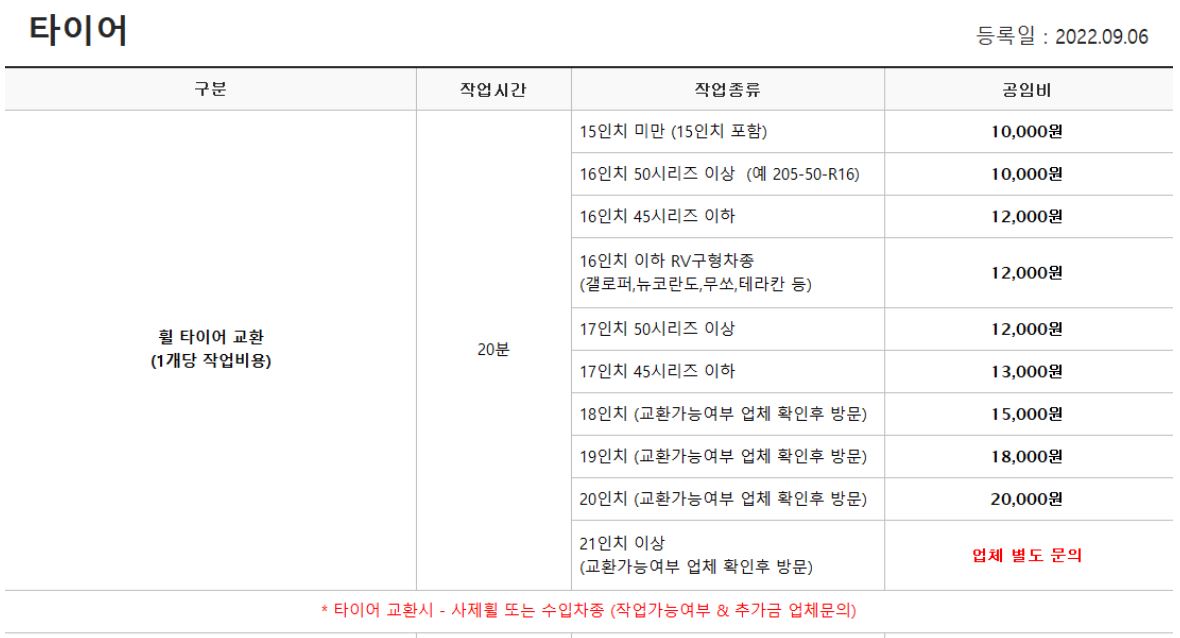 공임나라에 있는 타이어 교체 비용입니다. 공임나라 전국 모든 지점에서 표준공임으로 동일하게 작업이 가능합니다.