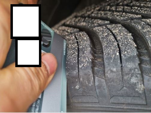 카드를 타이어 홈에 끼웠을 때 카드 끝과 마그네틱 간의 간격이 보이지 않는다면 타이어가 최소 4mm 이상이므로 아직 안전하다고 볼 수 있습니다. 그러나 위 그림과 같이 카드 끝과 마그네틱 간격이 트레드 위로 보인다면 타이어를 교체해야 합니다.