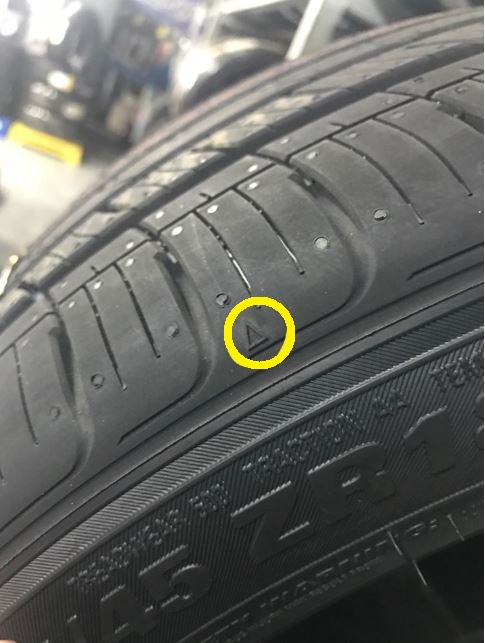타이어 옆면의 튀어나온 삼각형 모양이 새겨져 있는 부분을 따라 위로 가면 “마모한계선”을 확인할 수 있습니다. 직접 눈으로 확인해 보겠습니다.