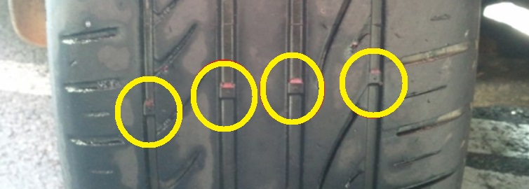 타이어홈 안쪽에 튀어나와 있는 “마모한계선”이 양옆의 트레드와 같은 높이가 되면 타이어가 많이 마모되었으므로 교체해 주어야 합니다. “마모한계선”과 트레드 높이를 눈으로 확인해 봤지만, 교환이 필요한지 정확히 잘 모르겠다면 다음과 같이 해볼 수 있습니다.